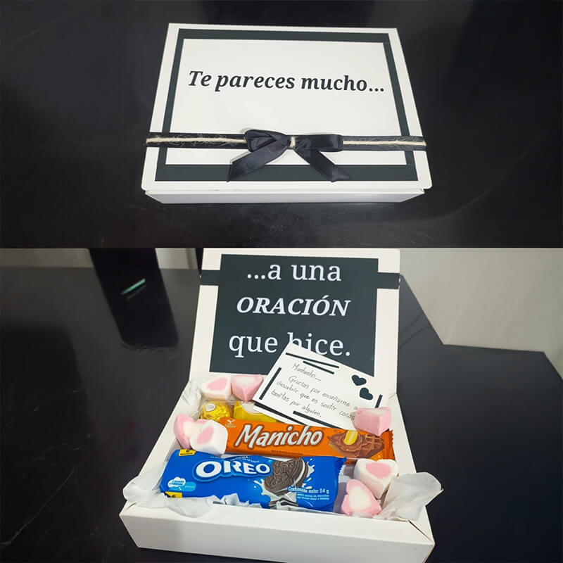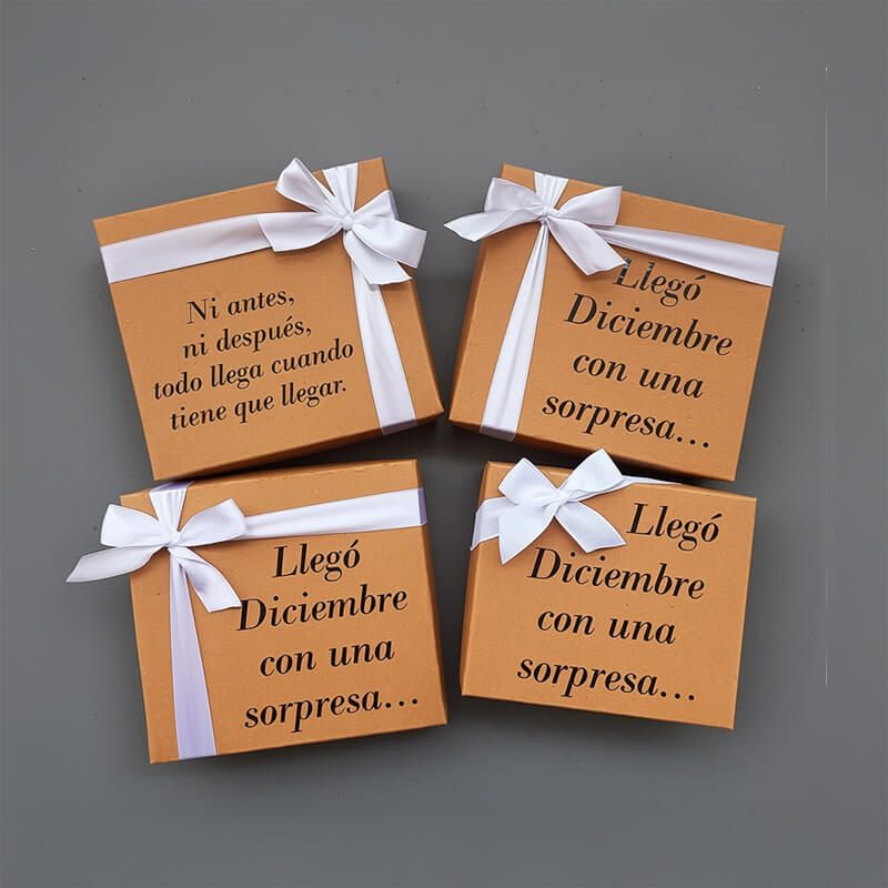 Elaborados en cartulina blanca o Kraft, ésta es la modalidad económica para regalar igualmente incluye un lazo, una frase y papelillo dentro de la caja